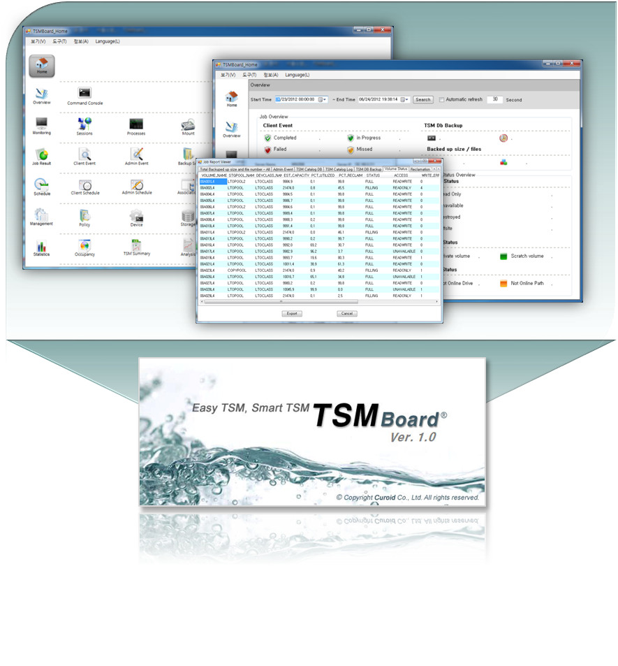 TSMBoard는 모니터링과 TSM의 관리 설정 및 리포팅 기능을 지원하는 효과적인 TSM 백업 관리를 위한 자사 솔루션입니다.